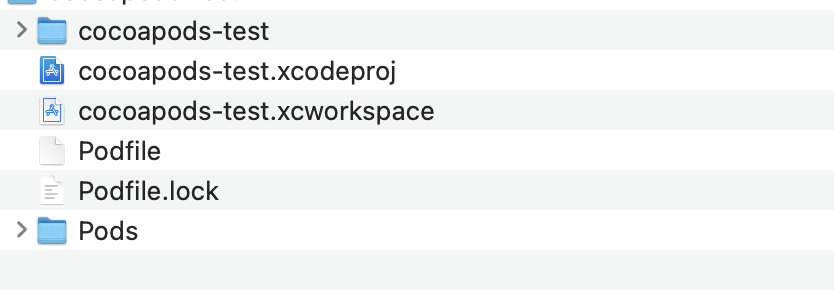 xcode project(xcodeproj) 의 workspace(xcworkspace)가 생성된 것을 볼 수 있다.